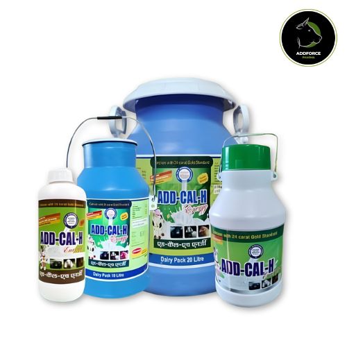 Add-Cal-H is a specialized liquid Calcium Supplement designed for dairy animals, fortified with the power of Energy and Oxytocin harmone Secretion, to ensure better milk yield, SNF, and fat percentage with improved palatability. It is essential for the healthy growth of the foetus during the final months of pregnancy and helps prevent milk fever and the prolapse of the uterus.